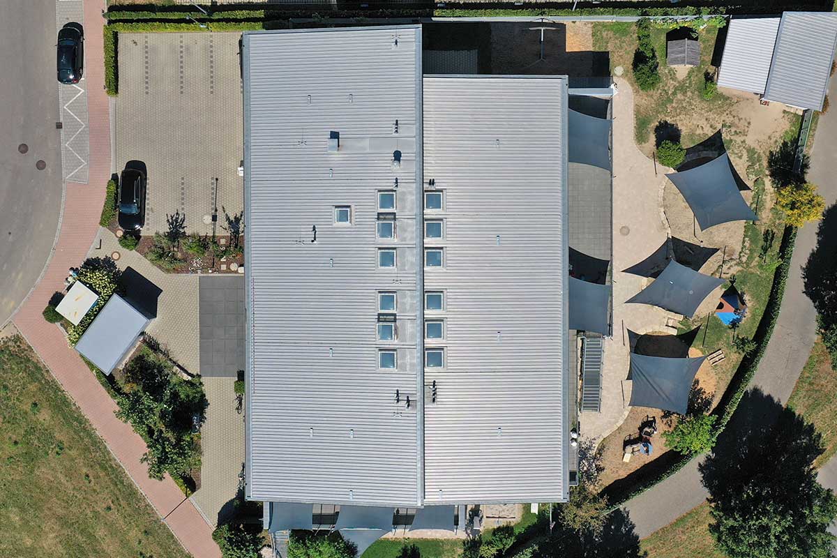 Baukonstruktion: KS-Mauerwerk, Holz-Brettschichtträger, Aluminiumdach gedämmt